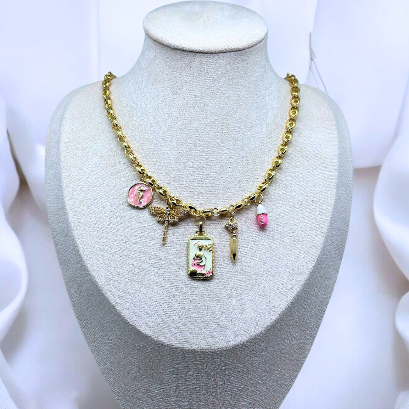A playful gold-tone necklace featuring charming pink accents: a seahorse, dragonfly, mermaid tarot, crystal charm, and a cute “chill” cup. Perfect for adding a whimsical, ocean-inspired touch to your look.
