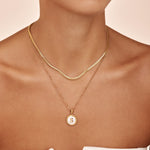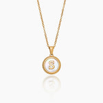 The Mother Of Pearl Initial Pendant Necklace features your chosen letter elegantly raised on a luminous round mother of pearl backdrop, framed in premium 18K gold plated stainless steel on a delicate chain. This waterproof, tarnish-resistant piece combines personal meaning with natural iridescence, creating a customized statement that maintains its luxurious shine while catching light beautifully through daily wear. Style this personalized pendant solo for a clean, elegant look or layer with other thin chains for added dimension.