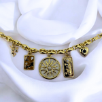 A dazzling gold-tone necklace adorned with meaningful charms: a cherub, a cosmic card, a radiant sun, a celestial tarot card, and a heart with a black gem. Perfect for adding a touch of celestial magic and romance to your look.