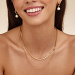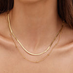 This double-strand necklace combines a smooth, reflective herringbone chain with a delicate satellite chain dotted with polished gold beads. Together, they create the perfect balance of texture and shine—elevated yet easy, bold yet minimal. Wear it solo for an instantly styled look or pair it with your favorite pieces for a statement that’s uniquely yours.