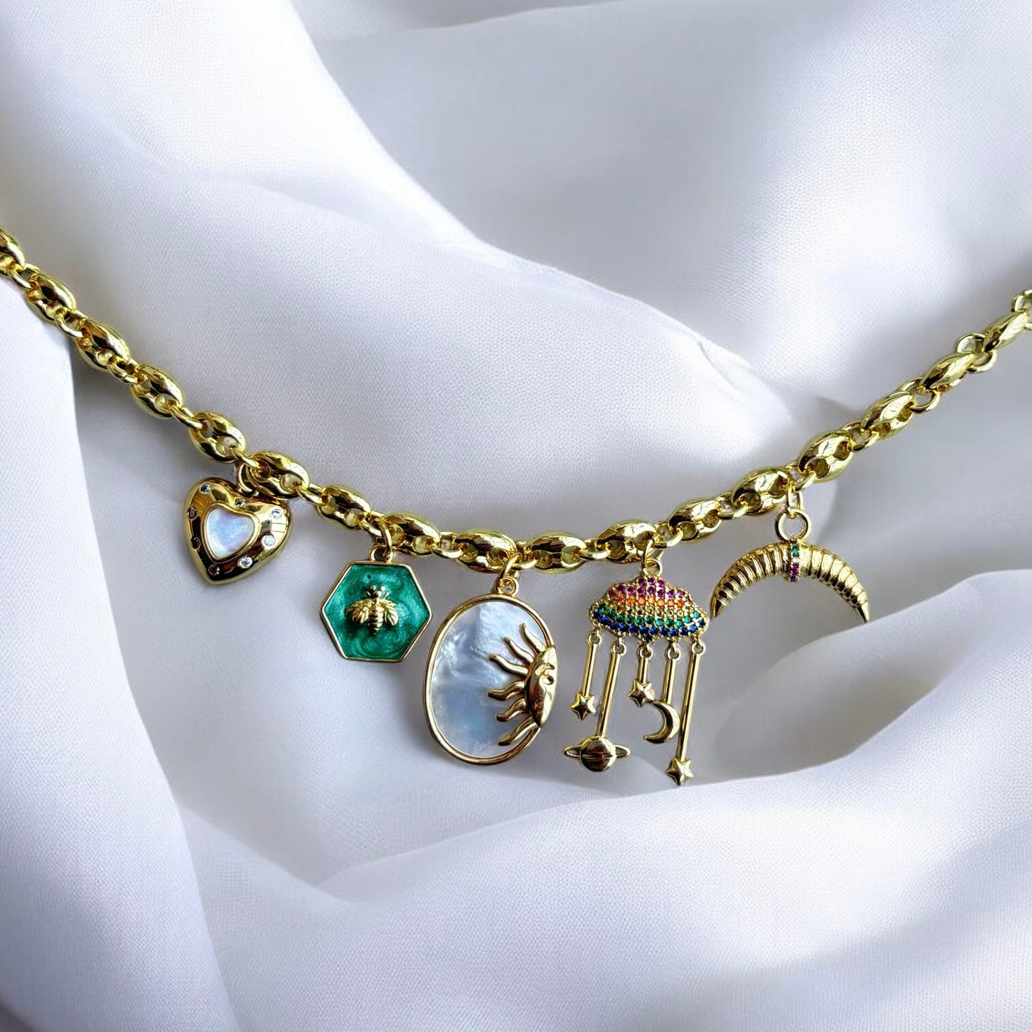 The Solar Harmony necklace combines celestial beauty and nature's charm in a captivating design. Featuring a mother-of-pearl heart, a golden bee on a green hexagon, a radiant sun, a rainbow planet mobile, and a crescent moon, this handmade piece embodies balance, light, and life. Its stunning mix of gold and colorful accents makes it the perfect statement accessory for those who embrace the harmony of the universe.