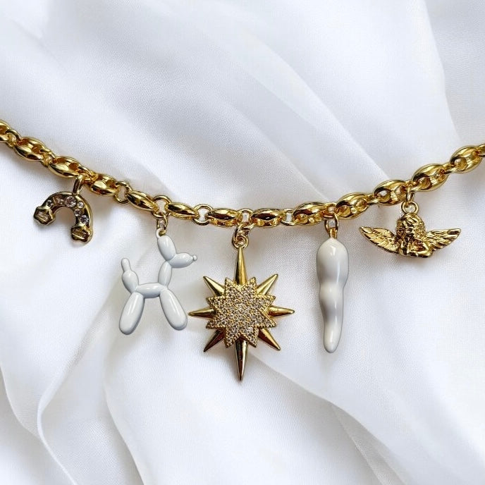 The Solere necklace is a radiant blend of elegance and whimsy, perfect for making a statement. Featuring a chunky gold chain adorned with charming details including a sparkling horseshoe, white balloon dog, dazzling sunburst, abstract charm, and a delicate angel this piece adds a playful yet sophisticated touch to any outfit.
