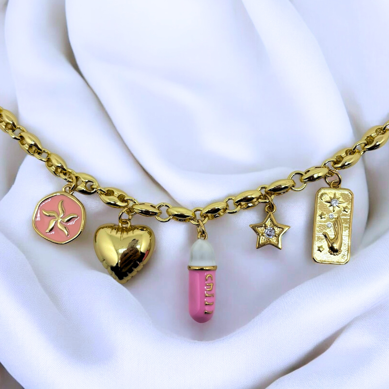 A playful and chic gold charm necklace featuring vibrant pink accents, celestial elements, and a touch of whimsy. Perfect for adding a youthful and trendy vibe to any look.