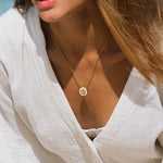 Introducing the Sunshine Necklace, where the magic of summer is captured in every detail. Imagine the warm glow of the sun gently cradled by the serene luster of real mother of pearl.