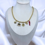A striking gold charm necklace featuring dramatic motifs such as a storm cloud, protective symbols, and vibrant accents. A bold and captivating piece that channels strength, passion, and resilience.