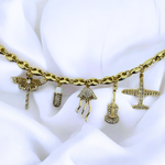 A dazzling gold-plated chain necklace featuring sparkling charms, including a dragonfly, jellyfish, guitar, airplane, and a pill-shaped pendant, symbolizing adventure, creativity, and the spirit of exploration.