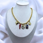 A bold gold-tone necklace featuring playful charms: a raincloud with crystal drops, a leopard, a red chili pepper, a golden capsule, and a balloon dog. Perfect for making a statement with a touch of whimsy and edge!