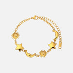The Celera bracelet dances with golden suns, moons, and stars — a radiant tribute to cosmic beauty, wonder, and the magic of the universe.