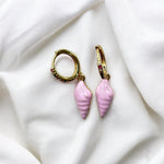 Coral Earrings are delicate handmade gold hoops adorned with pink seashell charms, perfect for adding a subtle touch of coastal elegance to any outfit.