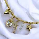 A radiant gold-tone necklace adorned with meaningful charms: a heart, a floral pendant, a sparkling crescent moon, a tooth charm, and a star. Perfect for adding a dreamy, symbolic touch to any outfit.