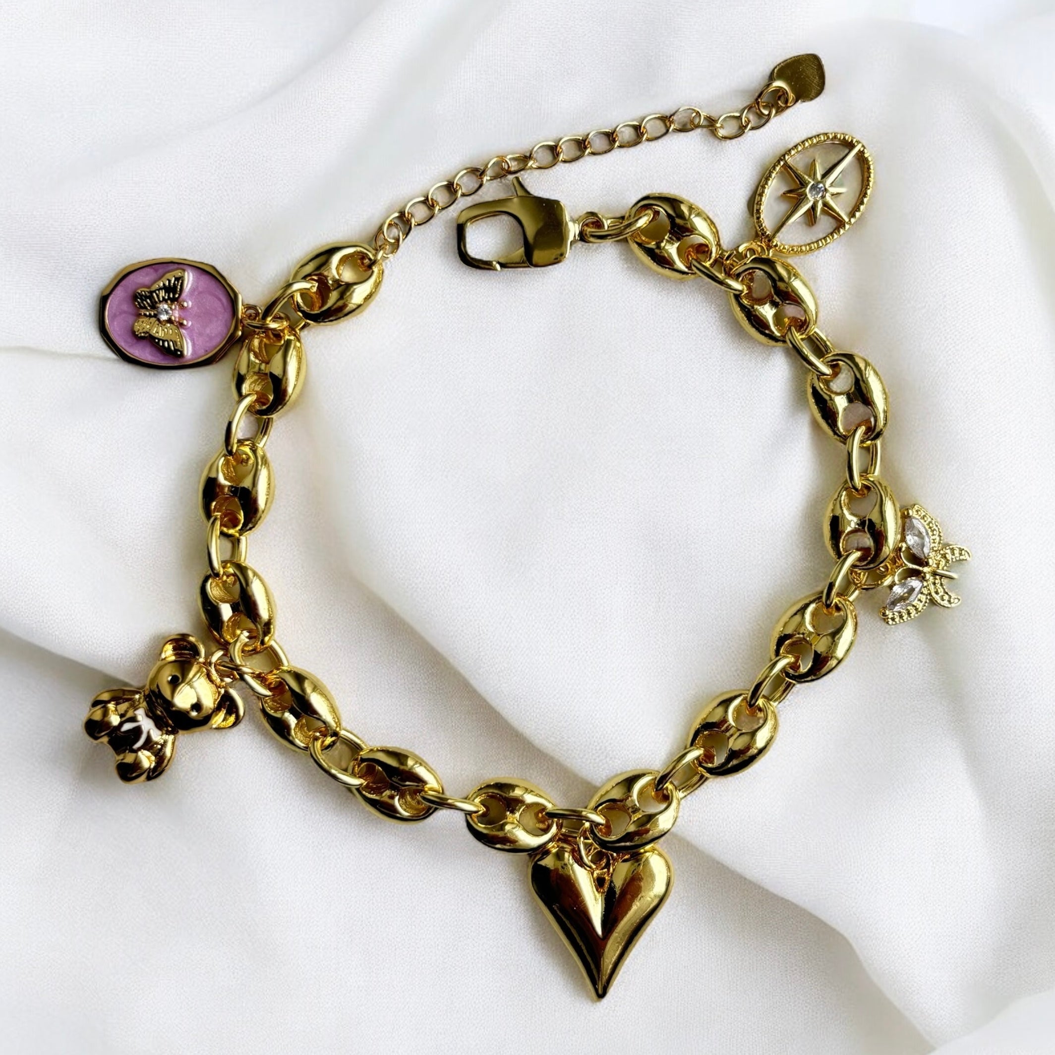 Introducing the handmade Esme Bracelet, a chic gold chain adorned with delightful charms. Featuring a cute teddy bear, a golden heart, and a lilac butterfly emblem, this piece combines playful charm with elegant sophistication, perfect for adding a touch of whimsical beauty to any outfit.
