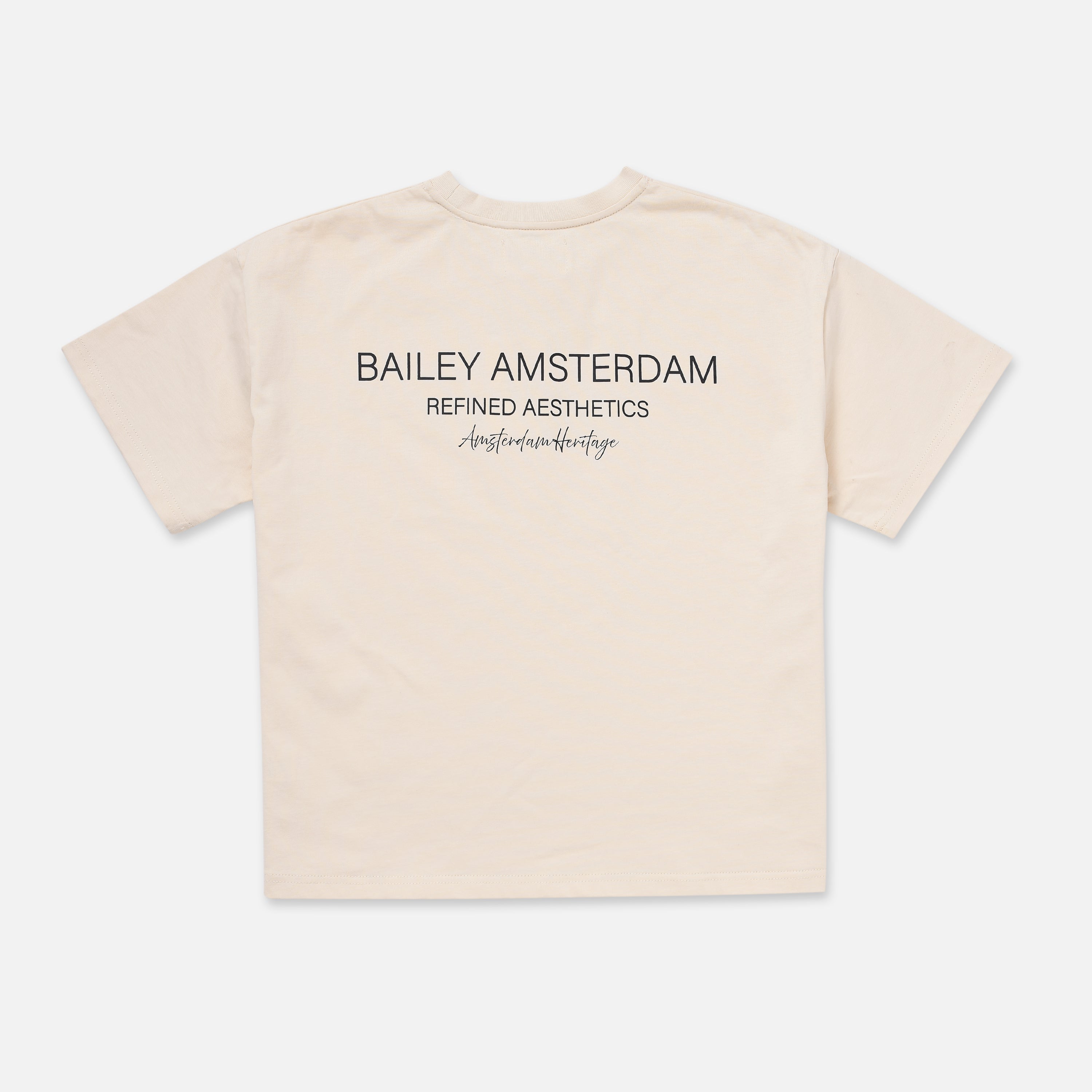 The Heritage Signature Tee by Bailey Amsterdam embodies a balance of timeless style and modern simplicity. Crafted from premium cotton, this soft, cream-colored T-shirt features a minimalist front logo and a bold, statement print on the back. Designed to be unique yet understated, it’s perfect for everyday wear and adaptable for any setting, making it a versatile staple for every wardrobe.