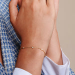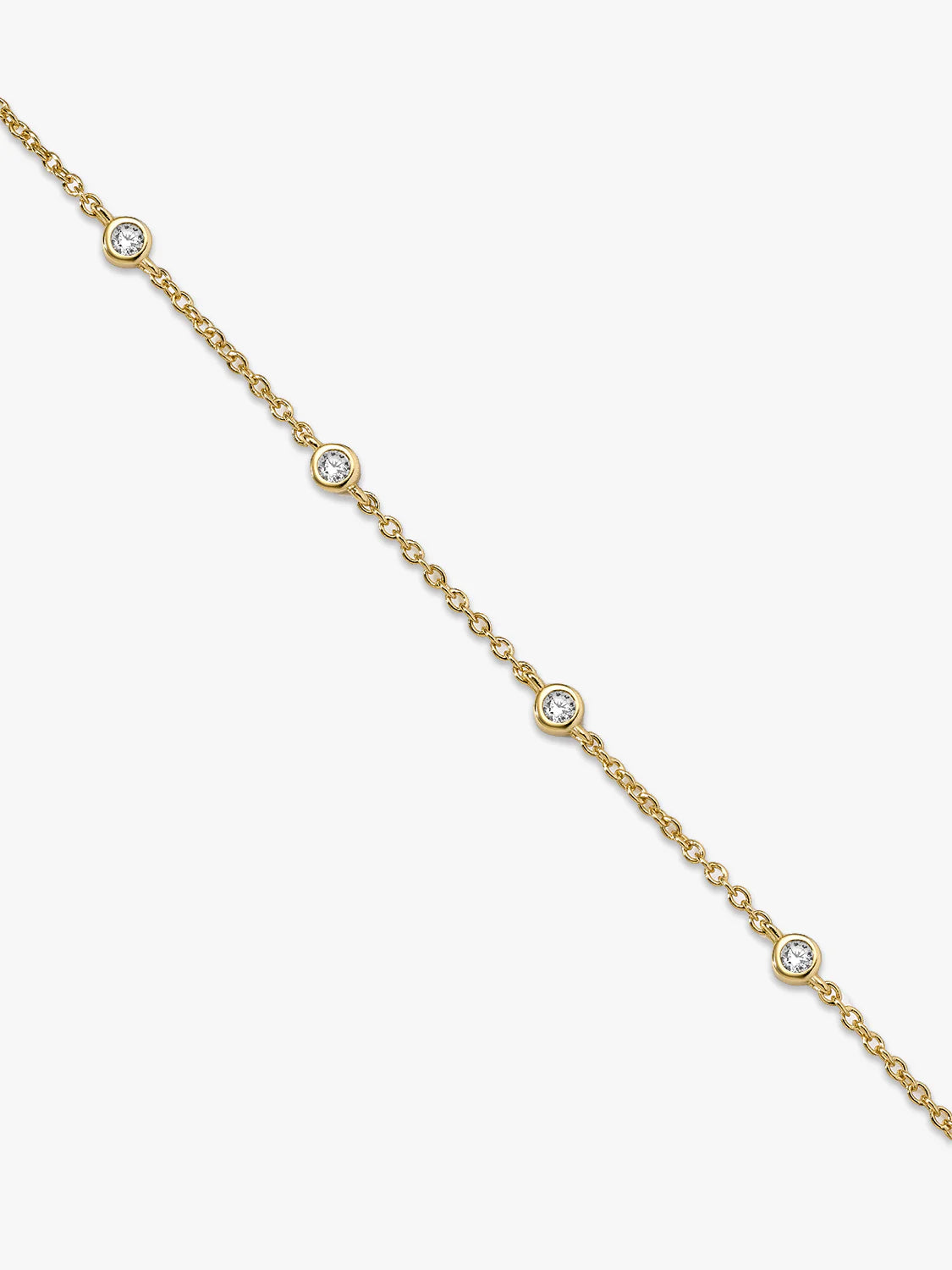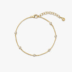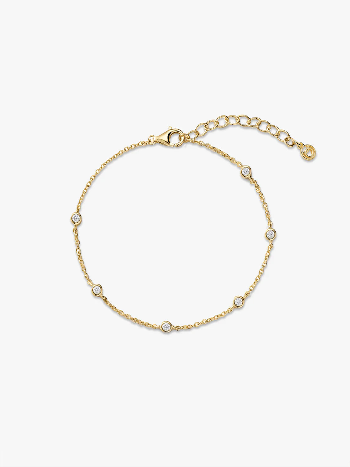 Crafted with 18K gold plated sterling silver, the Mini Round Crystal Bezel Station Bracelet showcases contemporary chain and high-shine Cubic Zirconia bezel stones. Its elegant chain separates each stone, allowing them to shine individually. Plus, its durability ensures you can enjoy wearing it for years to come.