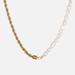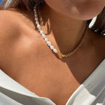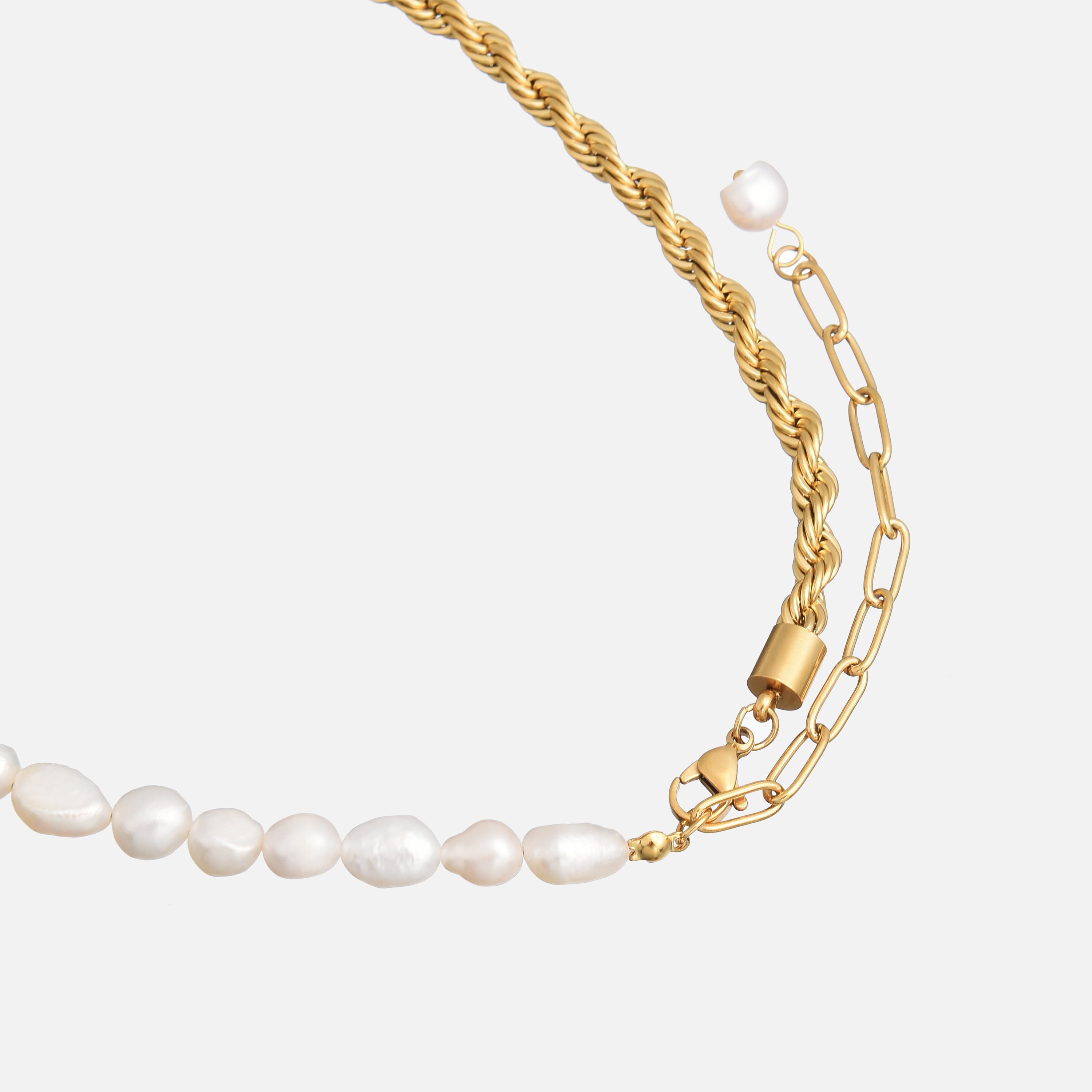 This gorgeous Adele Necklace is a statement piece that will make heads turn. Featuring a delicate string of white pearls, the necklace is further enhanced with a 18K gold plated chain.