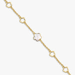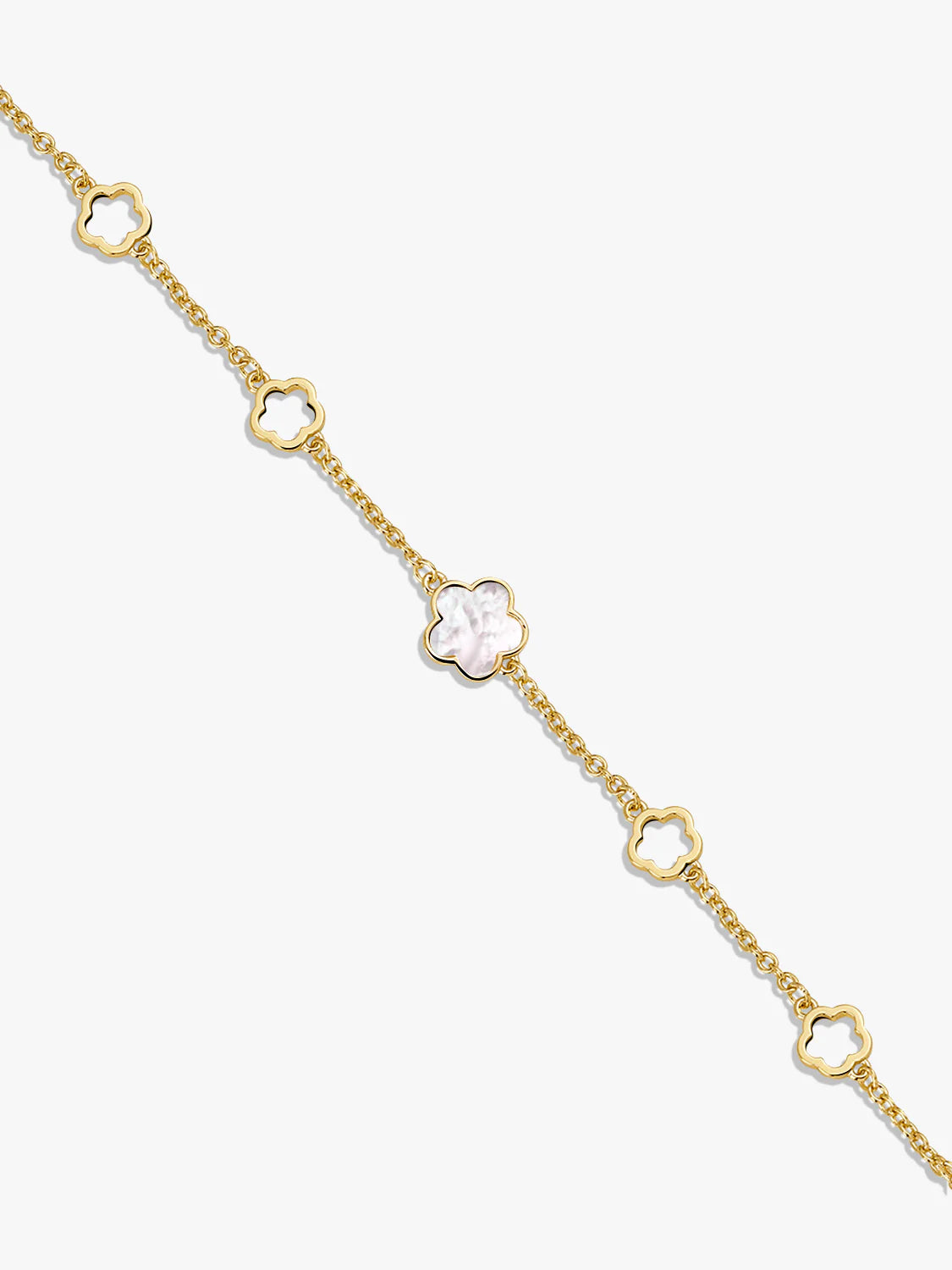 This bracelet is very beautiful, consisting of pearls and a floral pattern, delicately strung together with a 18K gold-plated chain. It showcases an elegant, positive, and unique style that is sure to catch people's attention. With its intricate design and high-quality materials, this bracelet is the perfect complement to any jewelry collection.