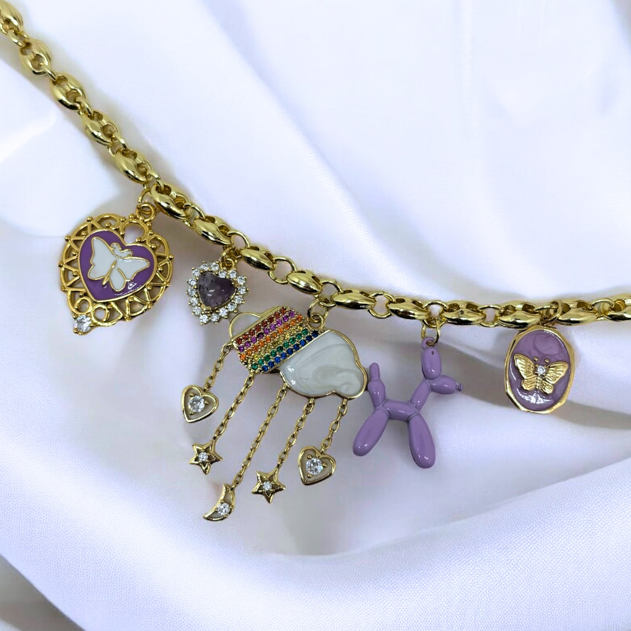 A whimsical chain necklace featuring playful and enchanting charms, including a butterfly heart, jeweled purple heart, rainbow cloud with dangling stars, lavender balloon dog, and an elegant butterfly medallion, blending fun and elegance for a dreamy aesthetic.