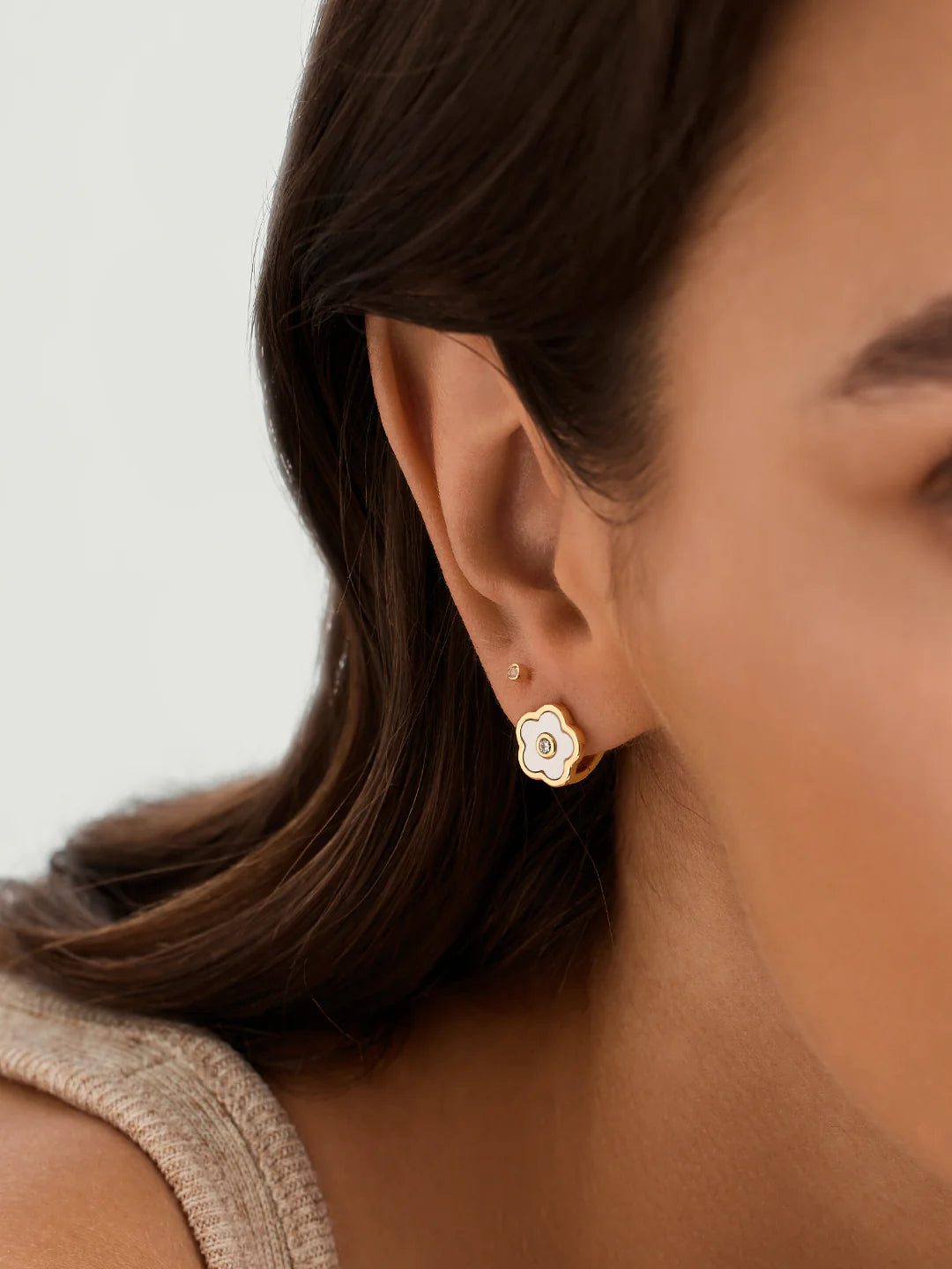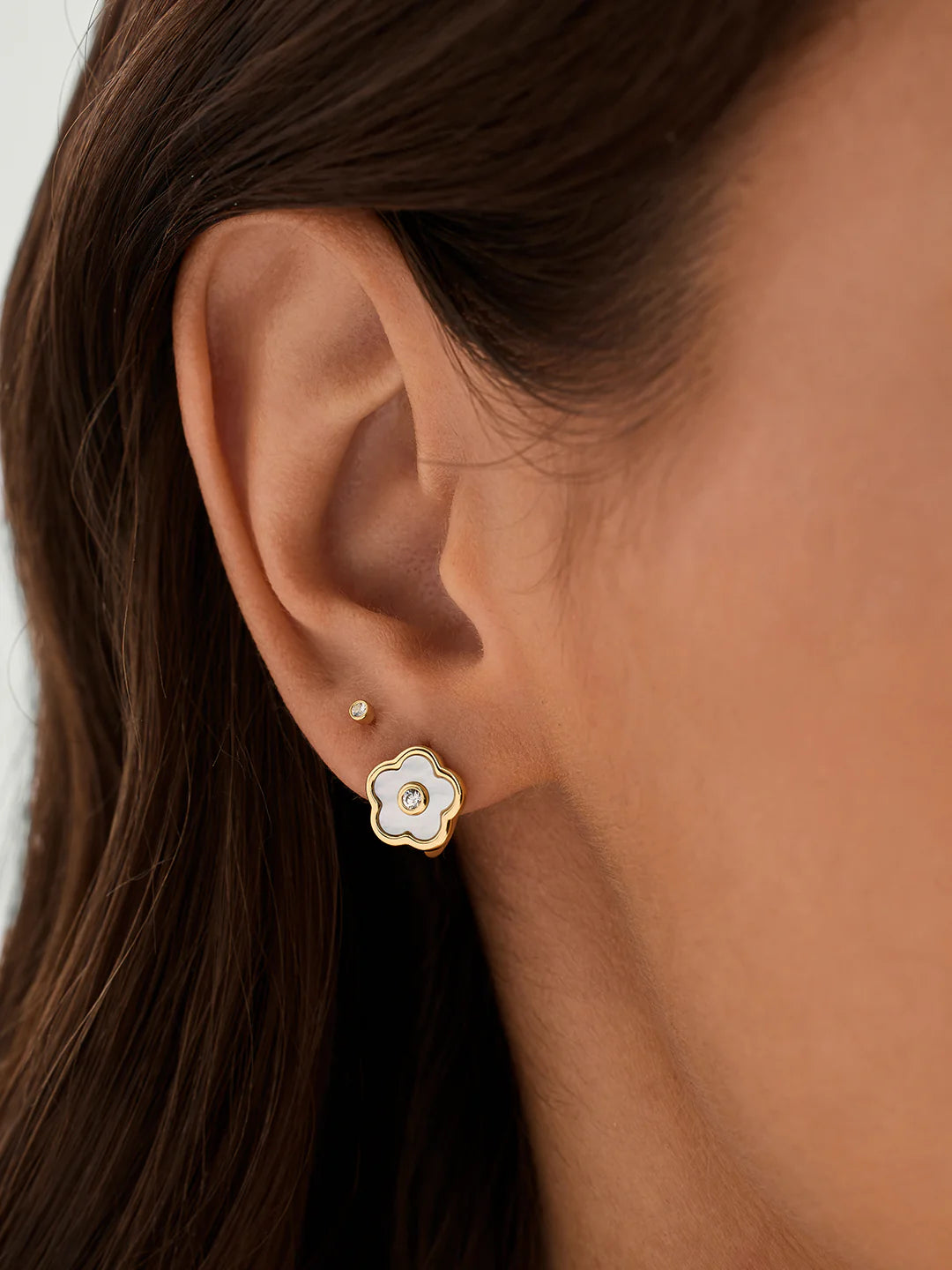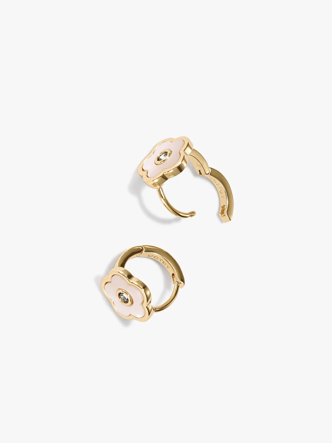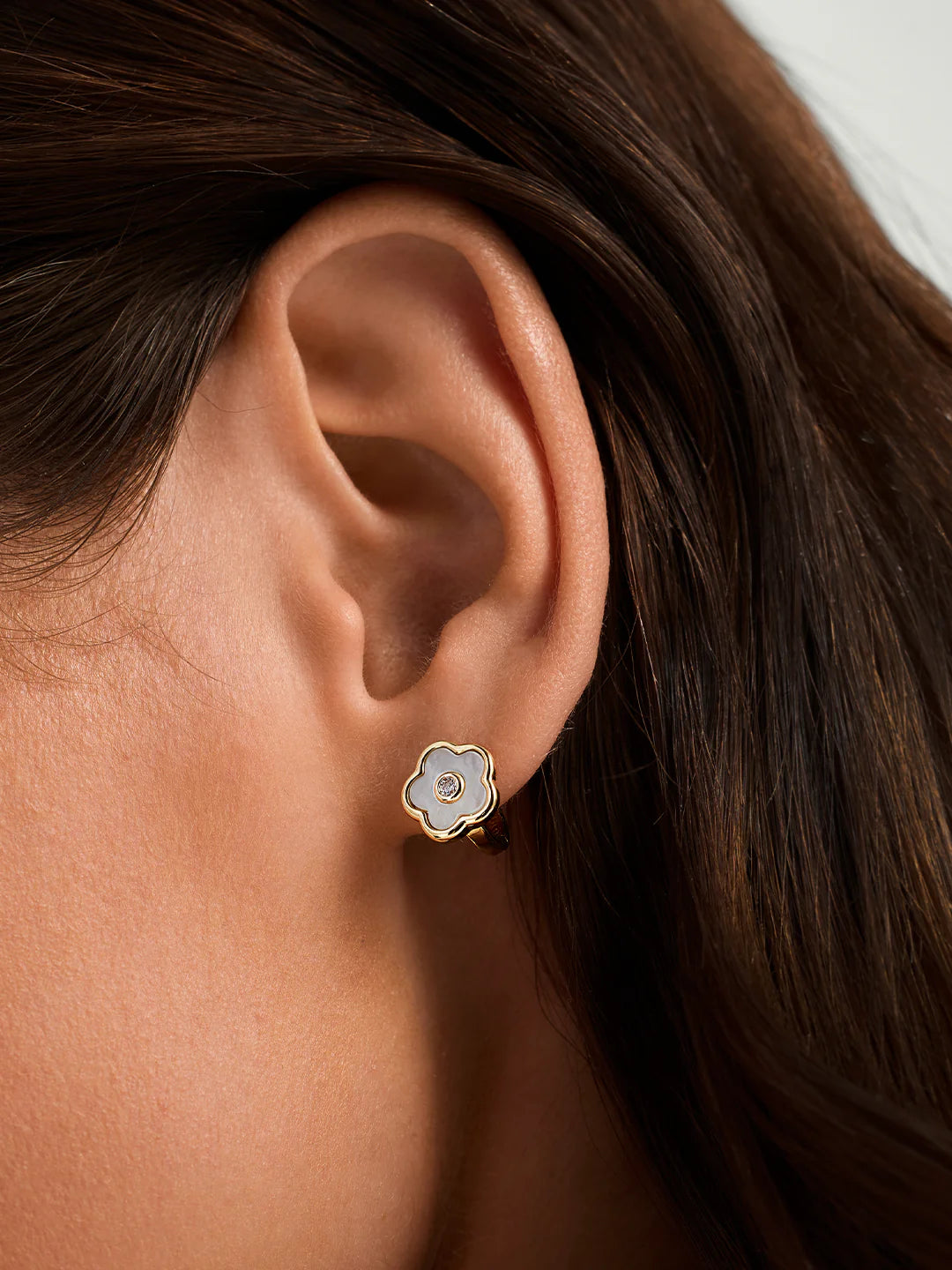 Our best-selling flower bracelet now has a matching moment—meet the Mother of Pearl Huggies. In 18K gold vermeil with a white sapphire center. Each piece is carved from natural mother of pearl, so every pair features slight tonal differences that reflect the beauty of nature.