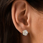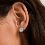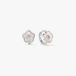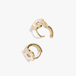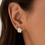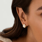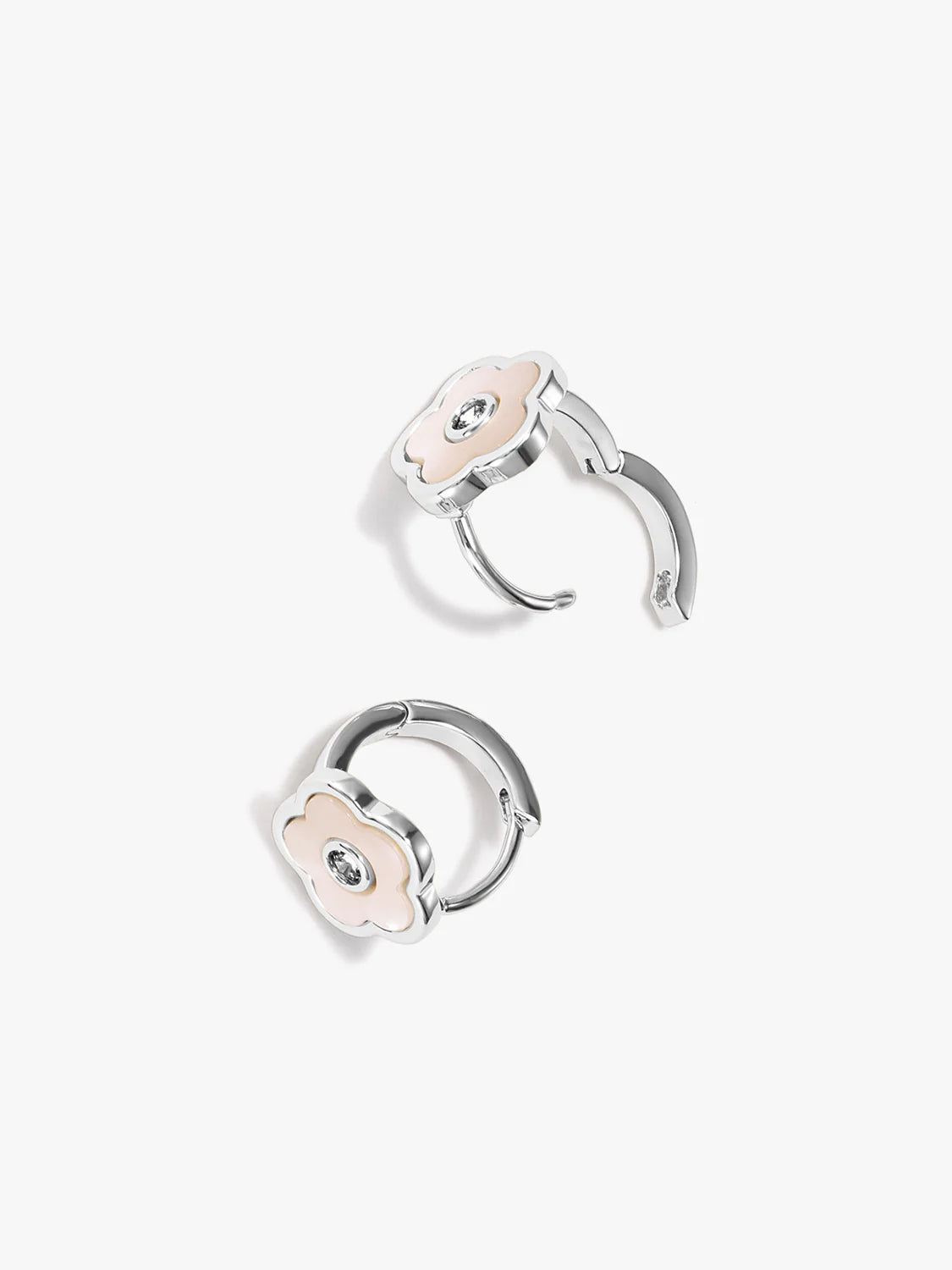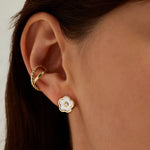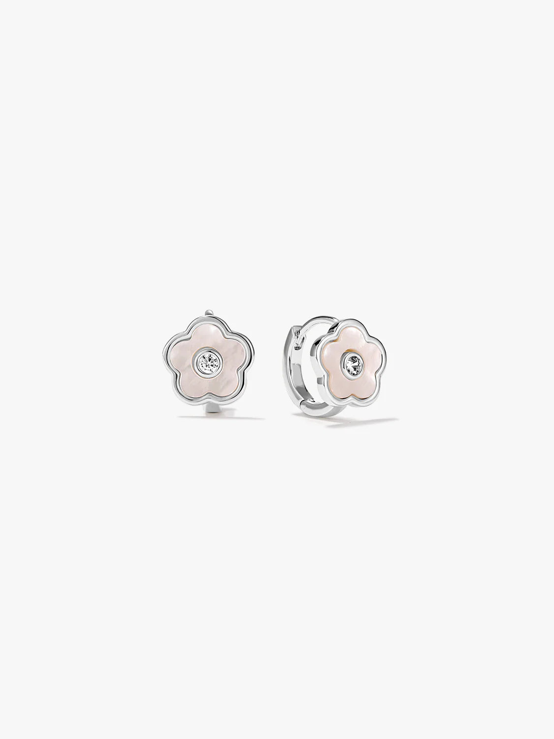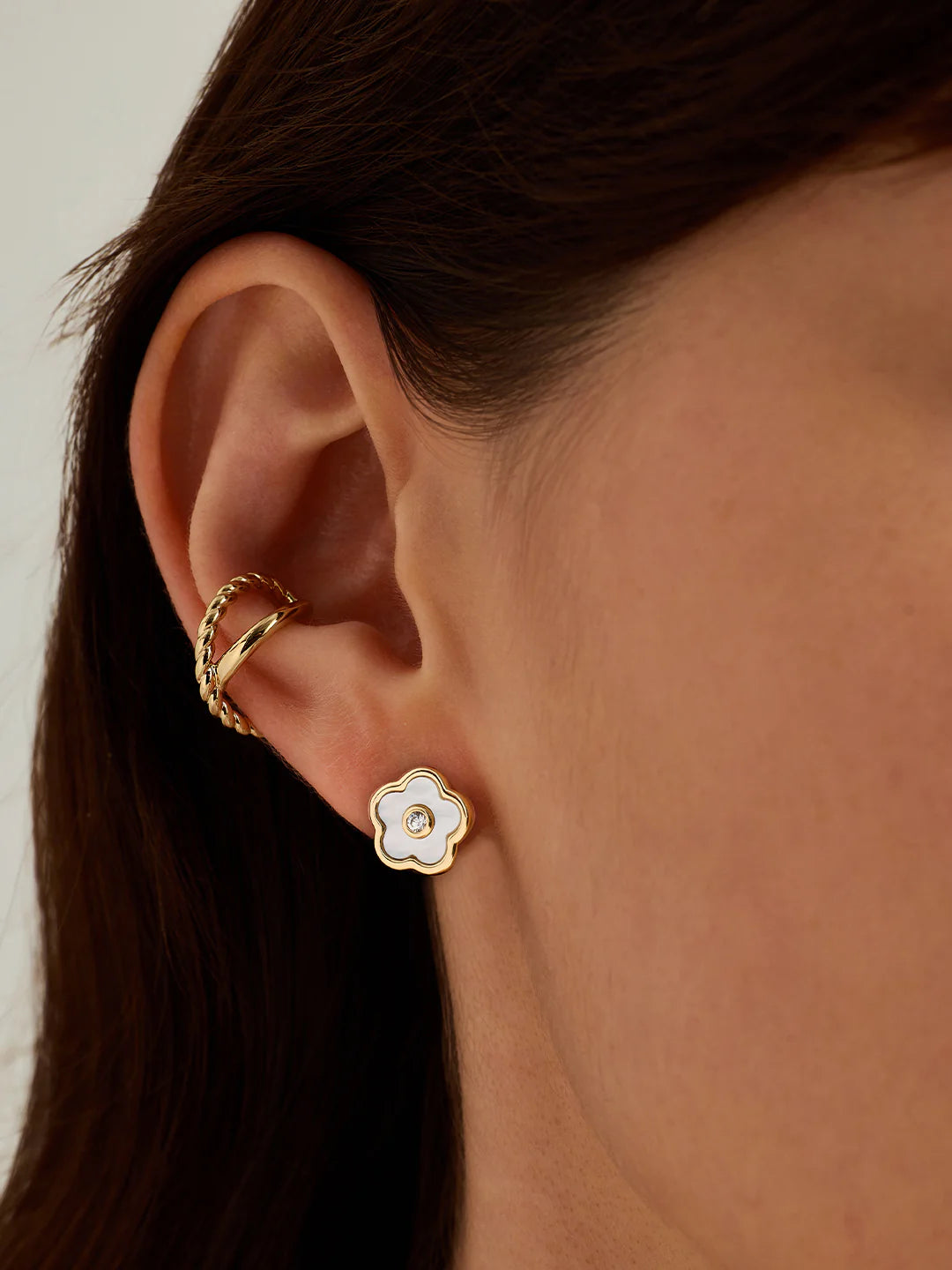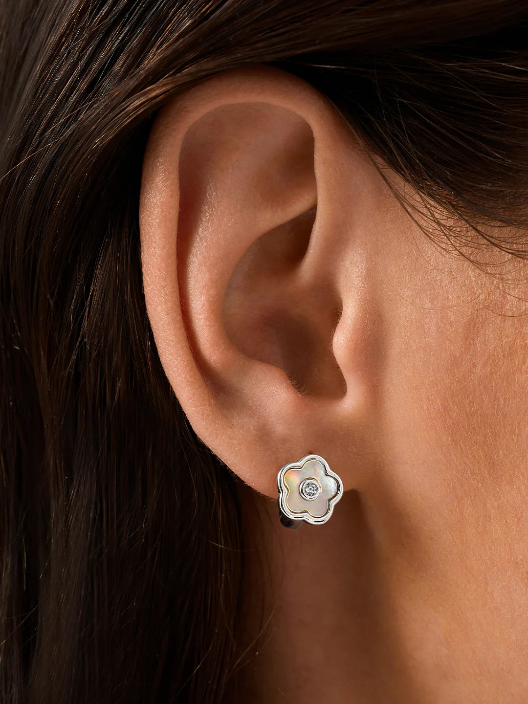 Our best-selling flower bracelet now has a matching moment—meet the Mother of Pearl Huggies. In 18K gold vermeil with a white sapphire center. Each piece is carved from natural mother of pearl, so every pair features slight tonal differences that reflect the beauty of nature.