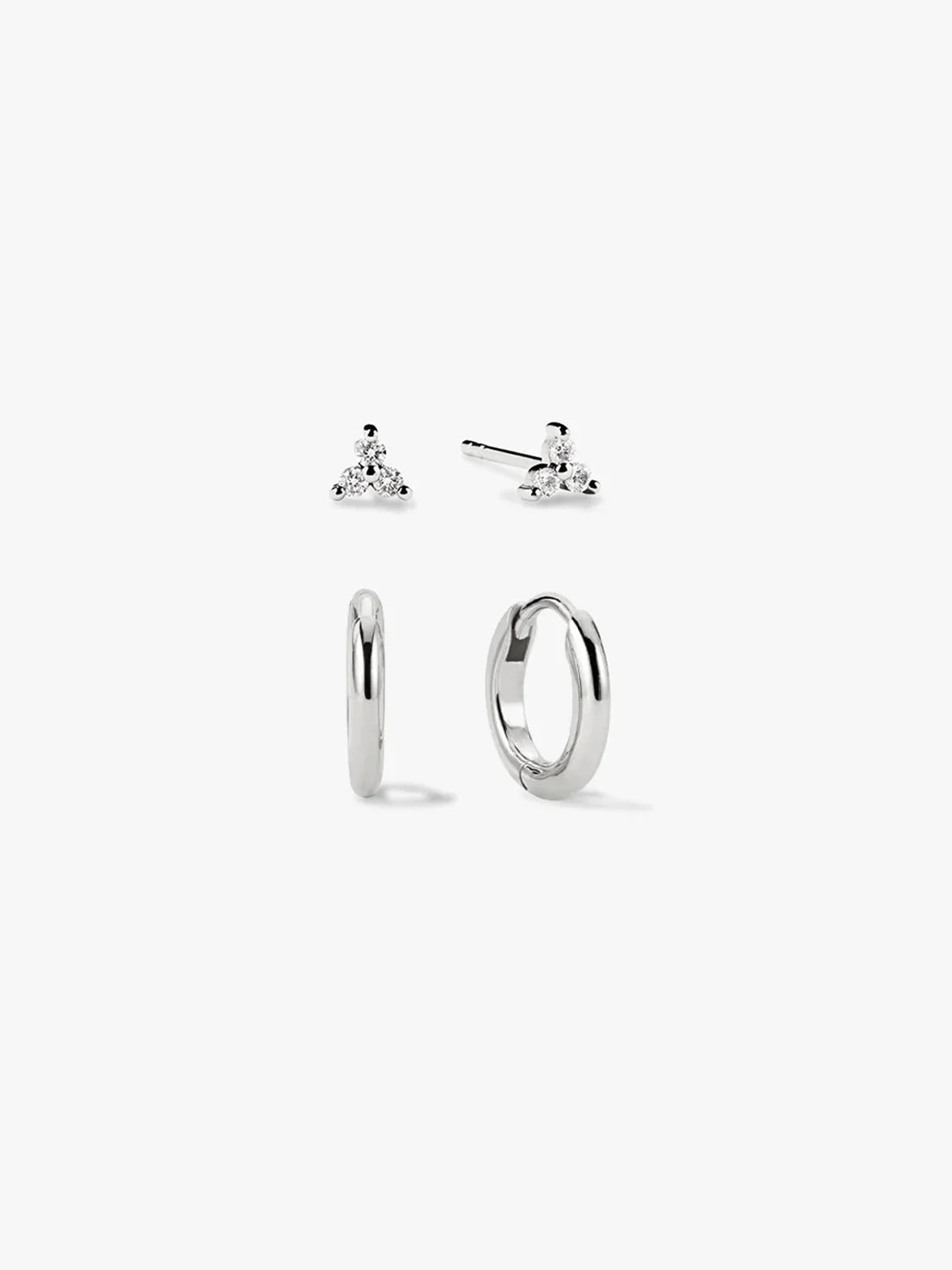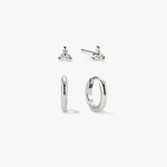 This Everyday Glam Bundle includes two pieces: Mini Round Huggies, and Trio Studs. Featuring the trio studs for a touch of elegance and the silver huggies for a sleek, everyday hug, this bundle is the perfect combination of subtle sparkle and effortless chic.