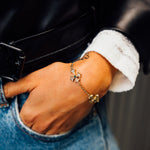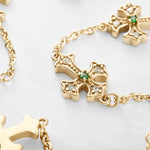 Handcrafted in 14k Gold, our Vintage Crucifix bracelet with triple cross design from the 1980s. Embedded with emerald & white zirconia gemstones, held on a figaro chain.