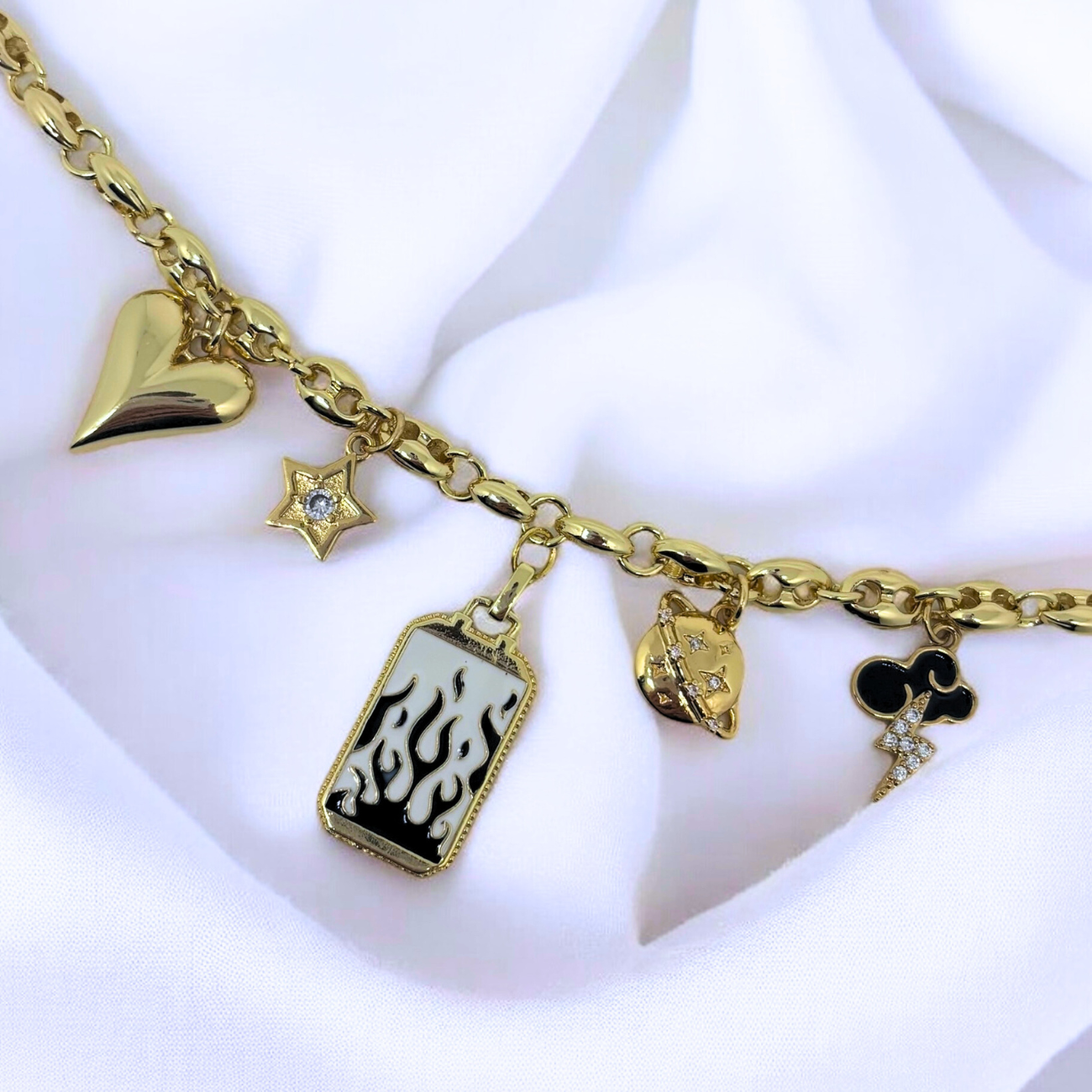 A bold gold charm necklace featuring fiery designs, celestial elements, and dramatic accents. A statement piece that symbolizes passion, energy, and cosmic allure.