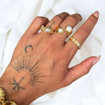 The Isolde ring embraces timeless elegance with its sculptural gold band and luminous twin pearls — a modern ode to romance and inner strength.