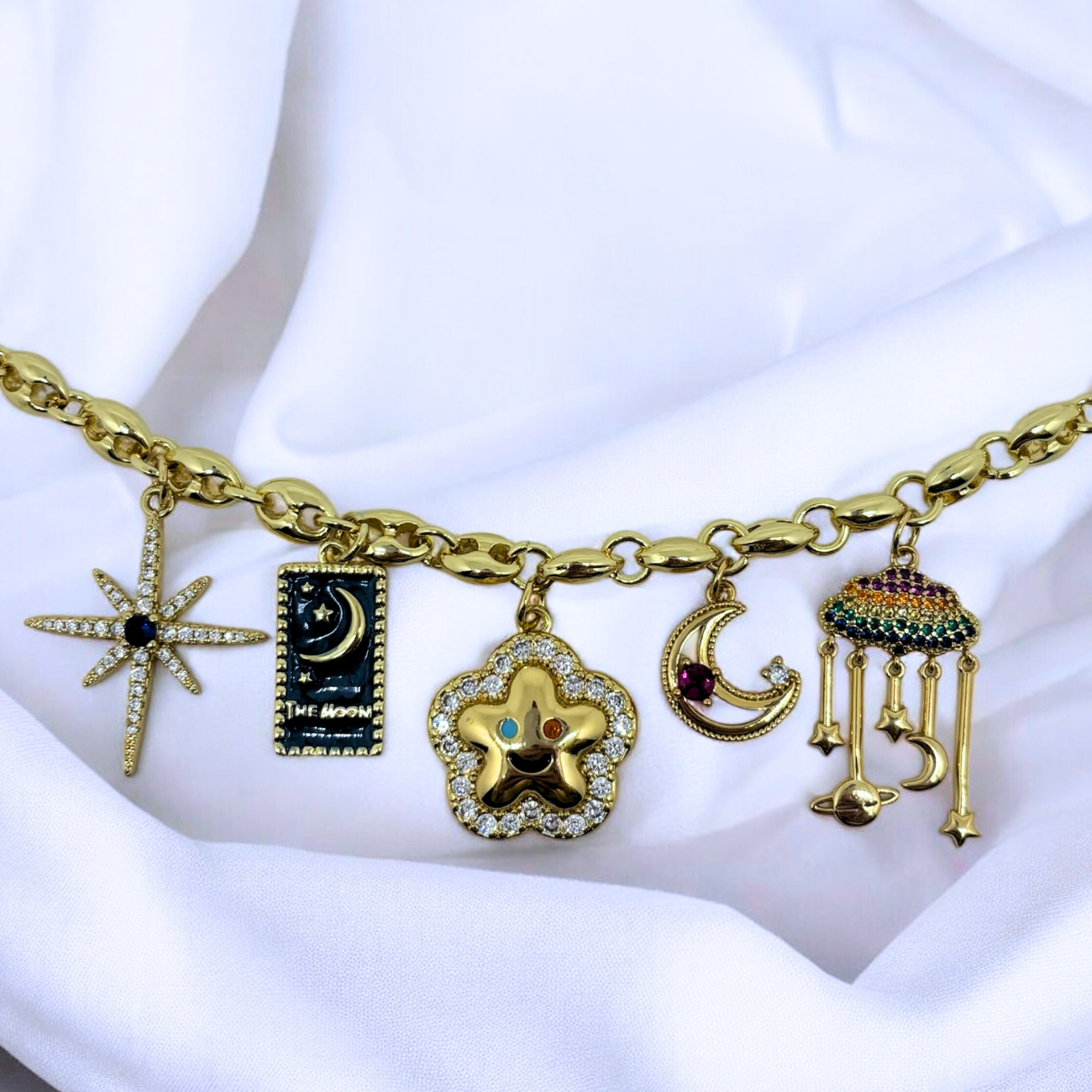 A dazzling gold chain necklace adorned with celestial and vibrant charms, including a sparkling starburst, moon tarot plaque, jeweled flower, crescent moon, and a colorful rainbow chandelier, celebrating the harmony of cosmic wonders.