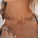 Shine on! This layered necklace featuring a paperclip choker and a snake chain effortlessly elevate your look.