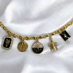 A tropical-inspired gold charm necklace featuring symbols of paradise, from palm trees to sea turtles, capturing the spirit of sunlit shores and serene ocean vibes.