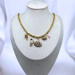 A stunning gold charm necklace inspired by the ocean, featuring delicate marine motifs like seashells, a seahorse, and a dolphin. A perfect accessory for capturing the beauty and serenity of the sea.
