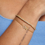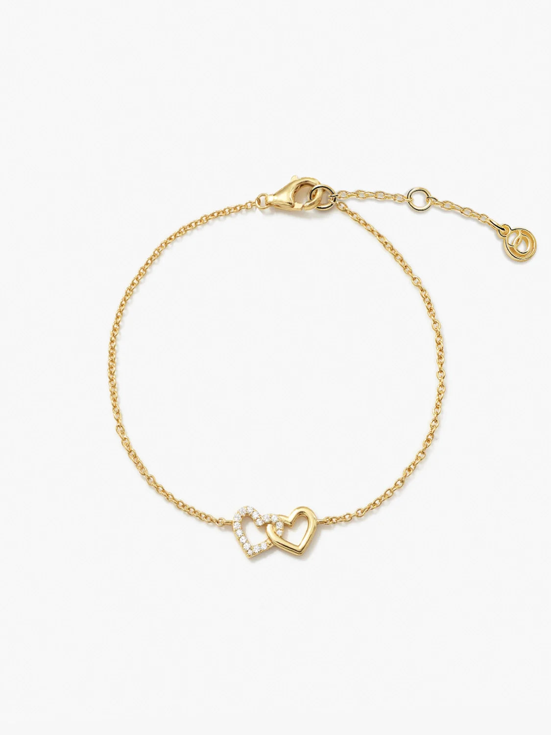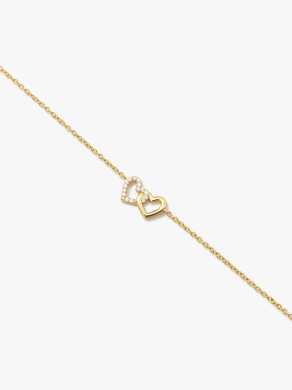 A delicately crafted piece from The Interlocking Double Heart collection, this bracelet is a testament to enduring connections. Fashioned with 18k gold vermeil, it features two hearts intricately connected, each adorned with shimmering crystals that mirror the brilliance of your love. Symbolizing unity, dedication, and the allure of relationships, this timeless bracelet is a graceful expression of lasting affection.