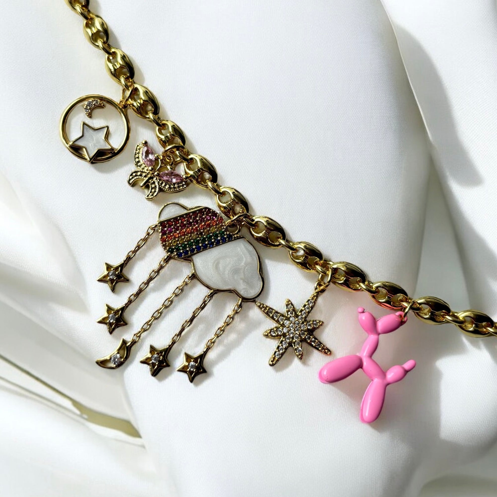 Discover the magic of whimsy with our handmade "Starlight Dreams" necklace. This charming piece features a gold chain adorned with a collection of enchanting charms: a delicate star in a golden circle, a pink balloon dog, a vibrant rainbow cloud with cascading stars, and a sparkling butterfly. Perfect for adding a touch of playful elegance to any outfit.